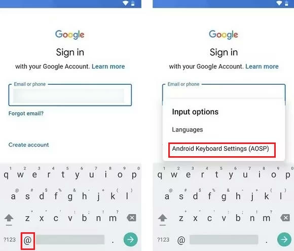 3. Press and hold the "@" button on the keyboard until Android Keyboard Settings (or Google Keyboard Settings) option shows up.