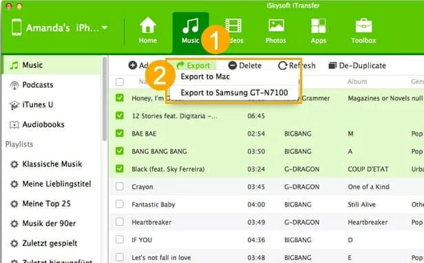 Now, simply select the iPhone music files you want to move to OnePlus phone, click the Export button, from its drop-down menu, select your receiver's name to begin transferring process.