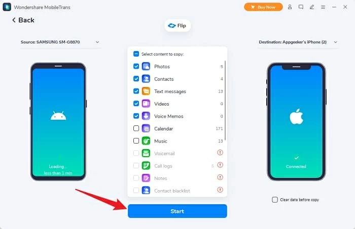 Choose the files you want and start transferring data from Samsung Galaxy to iPhone.