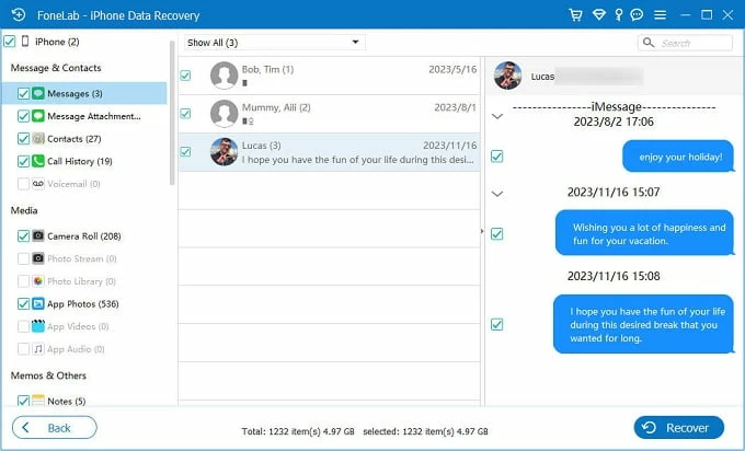 4. Select the deleted old conversations you hope to recover, click Recover and specify a destination to save them on the computer. This way, you can regain access to your deleted old iPhone text messages.