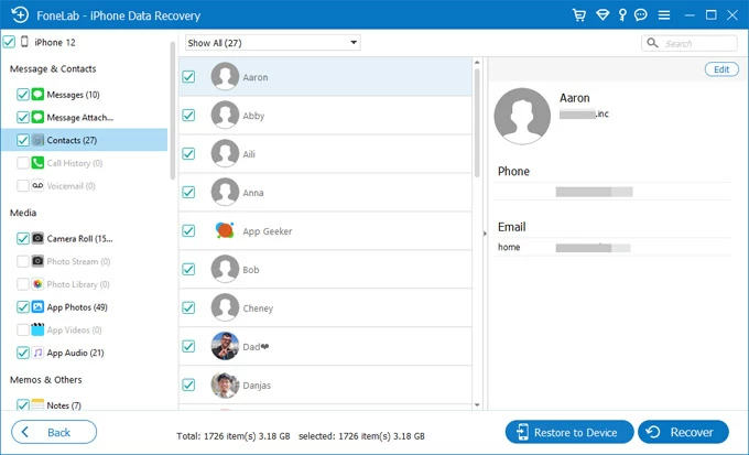 As mentioned above, the Appgeeker iPhone Data Recovery application can find missing iPhone contacts and display their details — name, phone number, and email address — allowing you to select specific contacts for direct recovery to your iPhone.