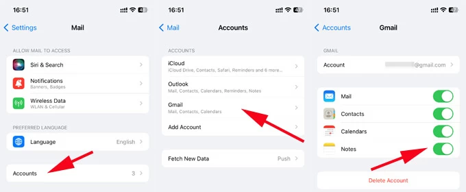 If one of your notes disappears from Notes app owing to software bugs, it's possible that the switch for Notes is disabled on the third-party account. The next thing you'll need to do is to determine whether or not the mail account for syncing with Notes are enabled.