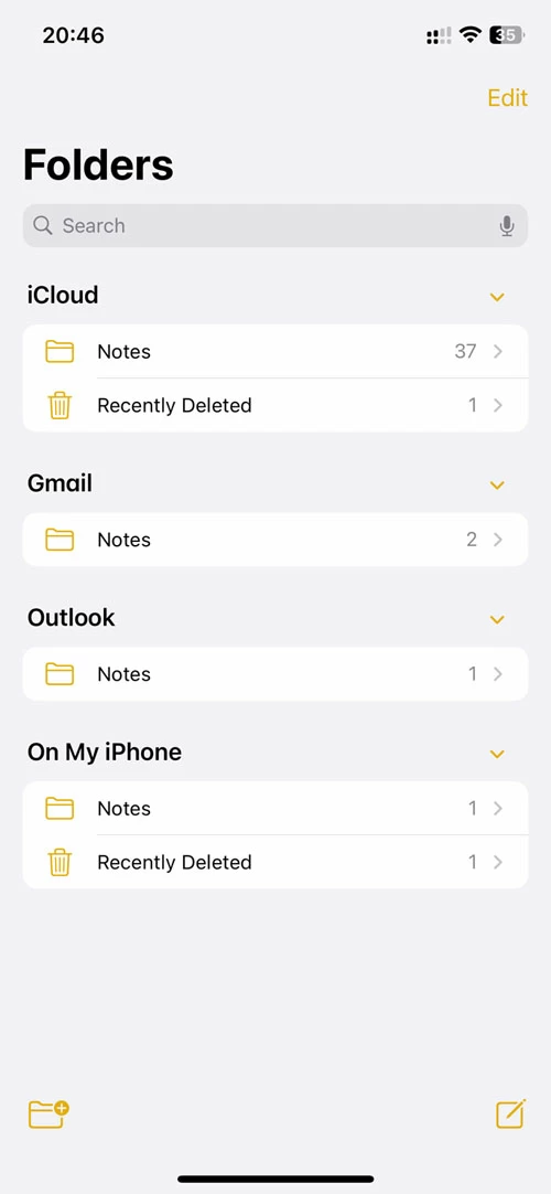 If you have a missing note that can't find in Notes app, chances are that it's connected to a third-party email service such as Gmail, Yahoo, or Outlook. When you're not sure where your notes are on your iPhone, you could browse the main Folders view within Notes app. All accounts you connect to your iPhone and sync with notes will appear between iCloud or On My iPhone, like the image shown below:
