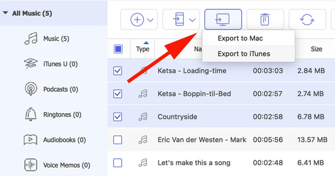 4. Export music from iPhone to Mac. After selection, locate the "computer" icon at the top toolbar and select "Export to Mac." Then select the appropriate destination and hit "Open" to save your music to your computer.