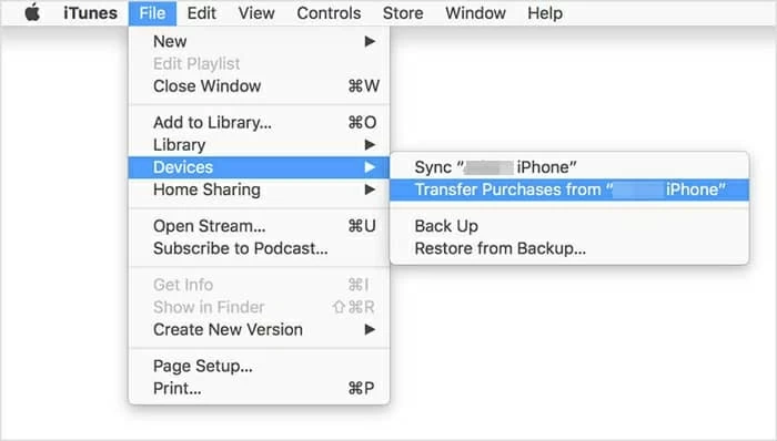 5. Navigate to File > Devices > Transfer Purchases from 'your iPhone' in the top-left of iTunes.