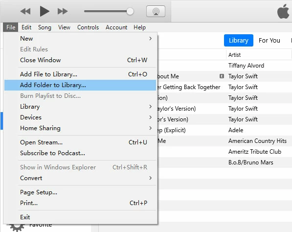 Open the latest iTunes on PC, click File from the top, then choose Add File to Library or Add Folder to Library to add all desired tracks from your computer to iTunes.