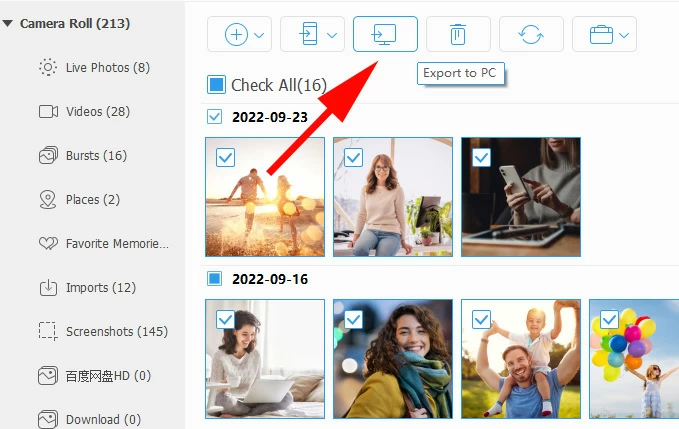 Click the "Photos" tab on the left sidebar, and select the photos from the displayed categories. Instead of picking pictures one by one, you can check the box next to "Check All" in the upper left to select all photos in the specific catalog.