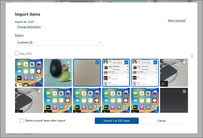 3. Select the photos you want to transfer in the Import window.