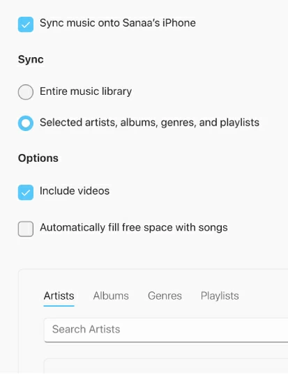 5. Select Entire Music Library in Sync section if you want to sync all your songs to iPhone from computer; or opt for Selected artists, albums, genres, and playlists to sync a selection of your tracks.