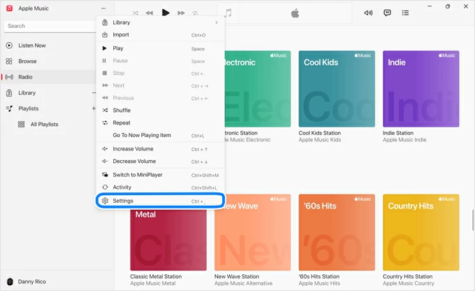 4. Click Settings. In Apple Music for Mac, click Music > Settings.