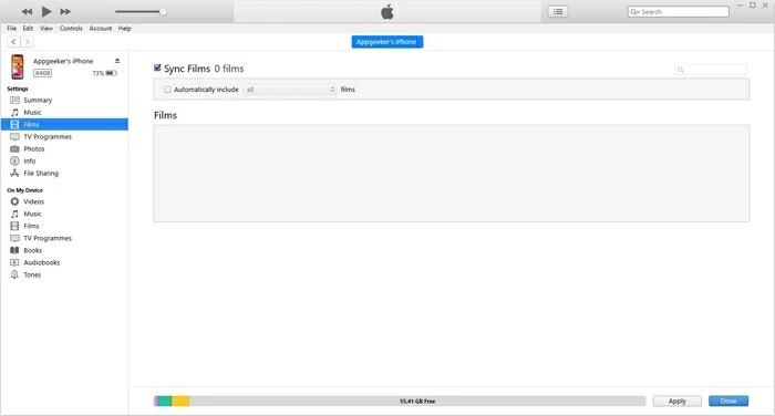 Next, in the iTunes menu, select "File" and "Add Files to Library" from the drop-down menu. A browser window will show up, and you can select all the videos on your laptop that you want to transfer. Then, select the "Films" tab on the left. Enable "Sync Films" and click "Apply". After the syncing is complete, all the selected videos will be available on your iPhone.