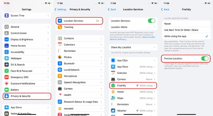 When Find My says no location found, verify whether it has been granted permission to access the location data of your Apple device. Make sure to turn on the Precise Location as well.