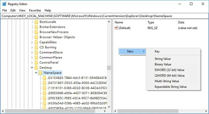 Step 3: From the left side on the Registry Editor window, navigate to the folder: HKEY_LOCAL_MACHINE > SOFTWARE > Microsoft > Windows > CurrentVersion > Explorer > Desktop > NameSpace.