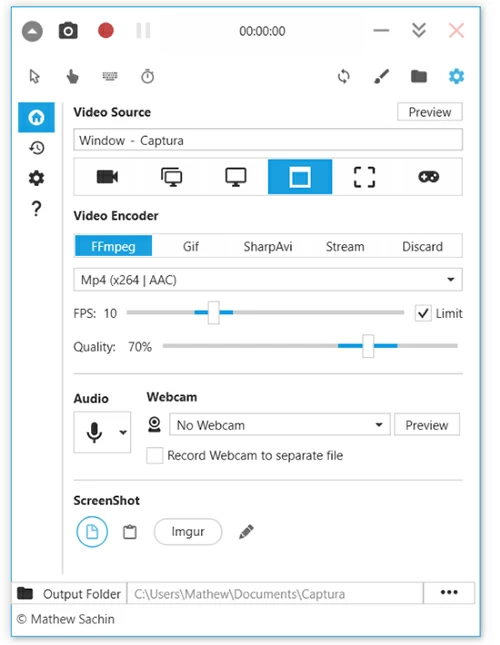 Although Captura relies on another multimedia program framework, FFmpeg, it has thus become a free open source screen capture software for Windows that can record any area on the screen or capture video clips on your PC, meeting most recording requirements.