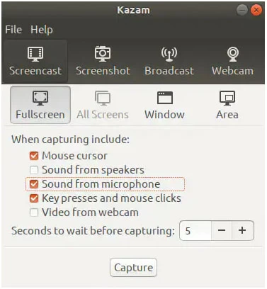 Kazam is another open source screen capture app that is easy to install and use, and you can download it from the Ubuntu Universe repository. Its page is very concise and clear, directly giving you two options of Screencast and Screenshot to let you perform your capture tasks. And you can export the recorded video in WebM, MP4 or AVI format and upload it to YouTube.