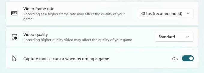 Configure one of the available screen recording options of Game Bar for whatever an app recording or a game recording in Settings > Gaming > Captures, including: