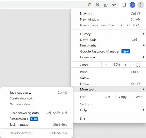 2. Click the ellipsis icon in the top right corner, move your cursor to More Tools and you can find Clear browsing data.