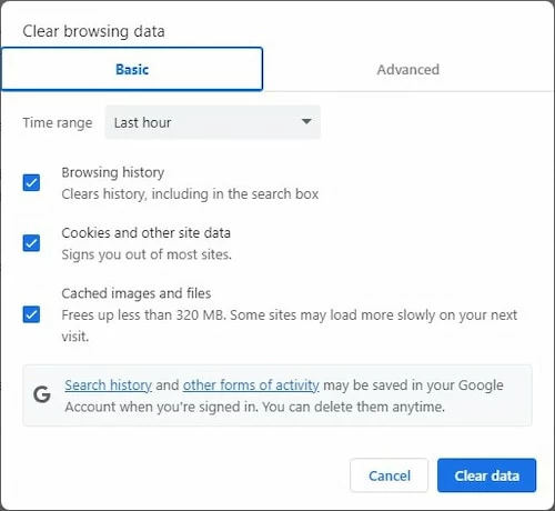 3. When you move to the page, there will be a pop-up window, check the boxes of cached files and hit on Clear data.