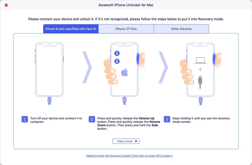 Now, plug your device into the computer via a USB cable. Generally speaking, your iPhone 7 will be recognized by iPhone Unlocker automatically, if not, you will see a pop-up appear, then please follow the instructions inside to put your device into recovery mode. When it finished, your iPhone 7 will be recognized soon.