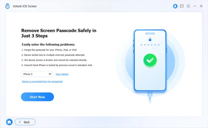 3. Once the tool recognizes the phone successfully, check your iPhone X model and confirm by pressing the Start Now button.