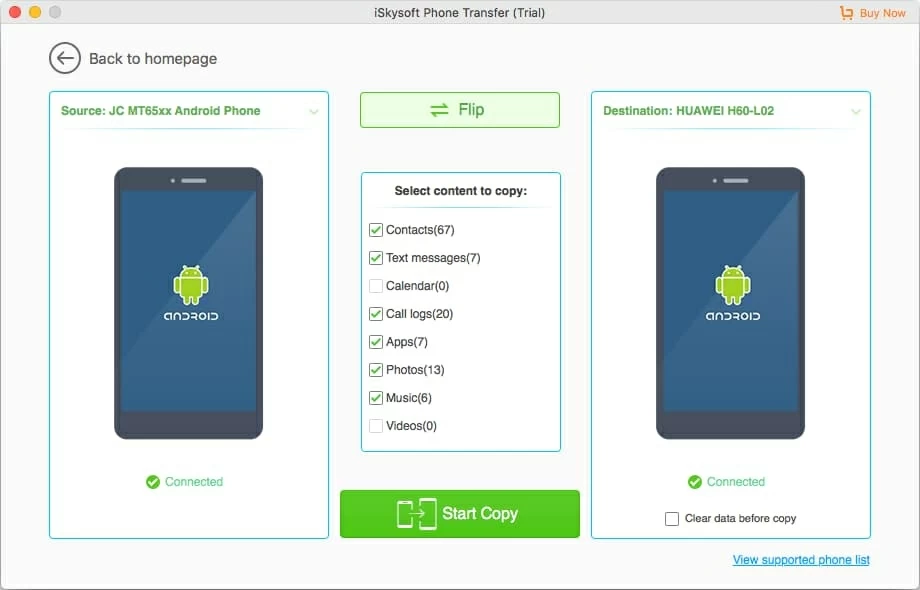 After you succeed in connecting both your Android devices, you will get a picture as below. You are in a position to decide which Android device to be the source device or the target device by a click of Flip button.