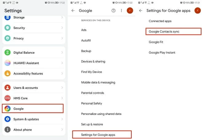 2. You are now ready to sync the contacts to your Google account. Open your Google account, go to Settings for Google apps > Google Contacts sync.