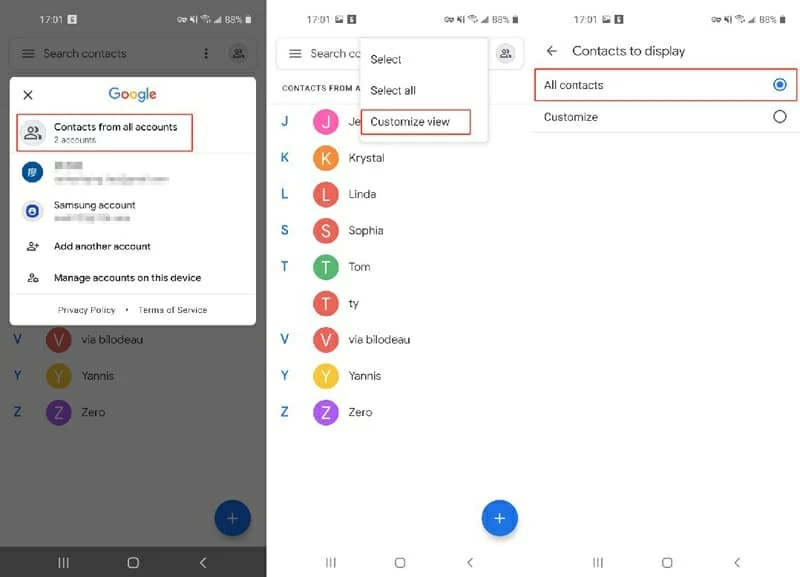 Make sure that both the "Contacts from all accounts" and "All Contacts" options are selected to display all the contacts that are linked to accounts set up in this Android phone.