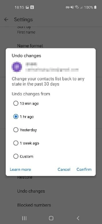 Rather than visiting to contacts.google.com, Samsung Galaxy users have an option of restoring Google contacts in Contacts app on the device. Simply tap the three horizon line > tap Settings > scroll the screen down and tap Undo changes > select a period of time > Confirm.