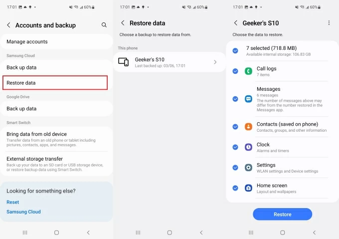 2. Return to the Accounts and backup menu, and under the Samsung Cloud section, tap Restore data.