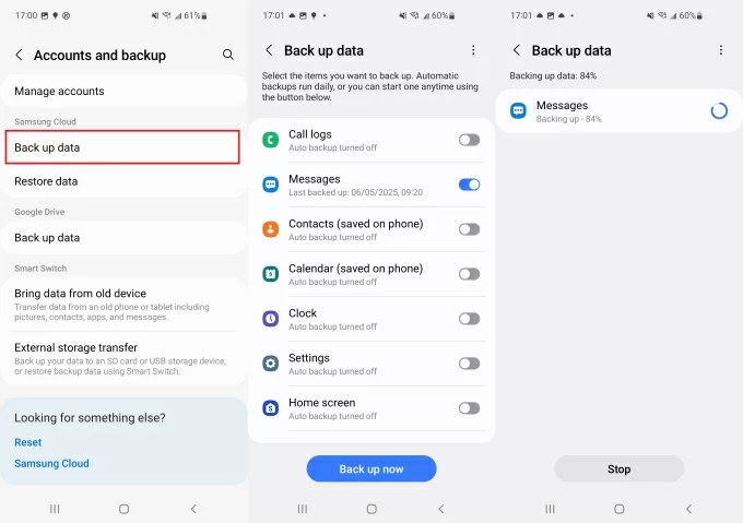 1. On your Samsung phone, open Settings > Accounts and backup > Back up data. Ensure that Messages is toggled on and check the date of the latest backup to confirm your permanently deleted texts are included.