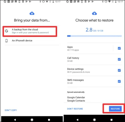 2. Restore backup files from Google Drive. Once your phone reboots, follow the instructions displayed on the screen until it asks you whether you want to restore the backup. From then, pick Google backup containing old texts and initiate the restore process.