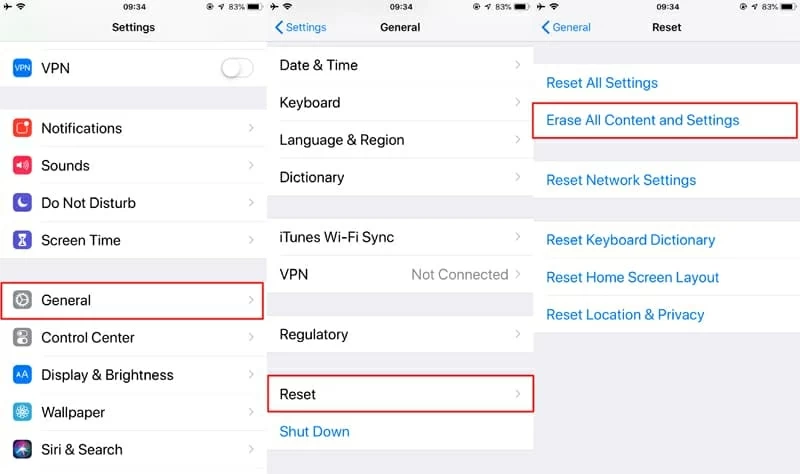 Step 1. First, reset your iPhone by navigating to Settings > General > Reset > Erase All Content and Settings > Erase Now.
