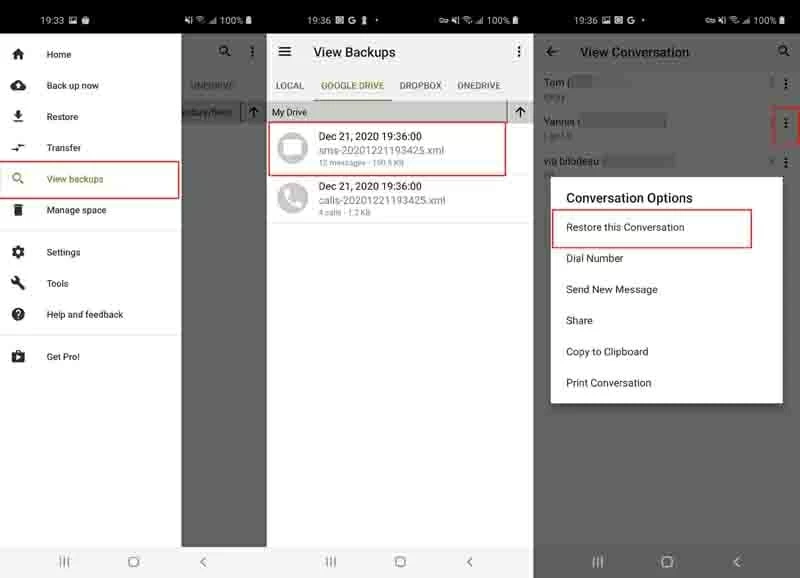If you need to recover a specific conversation from Android or the messages with one particular contact, navigate to Menu > View backups to load the conversations included in the backup file. When you find the conversation you want to restore, tap the icon represented with three dots on the right and choose Restore this Conversation.