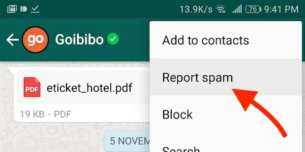 Step 4: Tap Report spam. Also, do not forget to mark check on the "Block contact and delete messages from the chat."