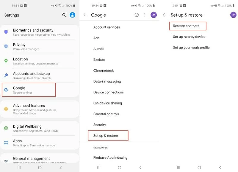 Or you can recover deleted contacts from Google backup using your Android phone. Take Samsung for example, open Settings, then scroll down and tap Google to select Set up & restore. Choose Restore contacts option to restore all contacts that have been synced to Google before.