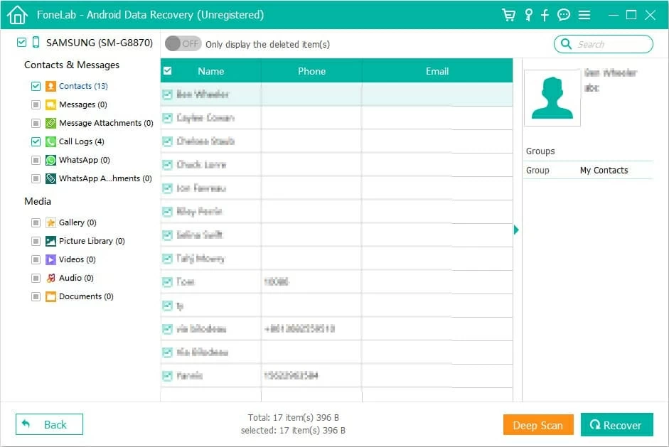 4. Preview the deleted numbers on your Samsung device. The software just takes some seconds to scan out and list all the contacts for you.
