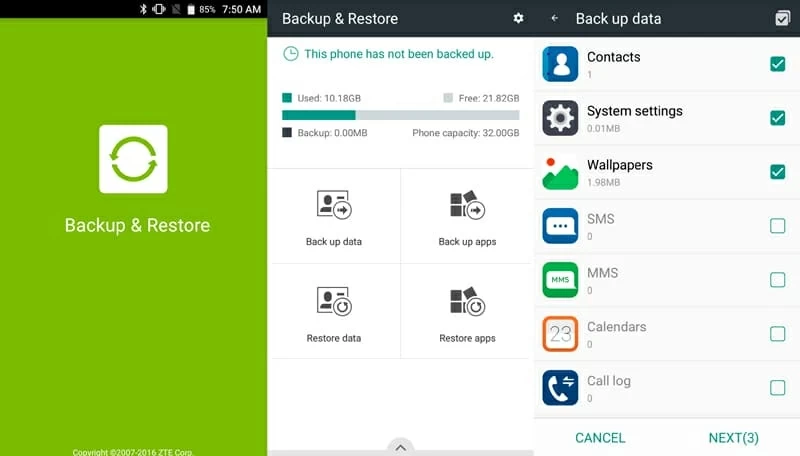 Some ZTE phones come with built-in Backup & Restore option. ZTE Blade X MAX is a representative case. If you are an owner of such phone that backed up your data before, there is another choice to restore your lost ZTE phone contacts over the following steps.