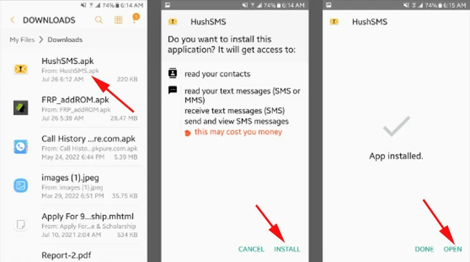 5. After download, navigate to My Files > Downloads, then install HushSMS.apk.
