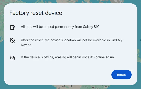 7. Click Next to initiate the factory reset without password and remotely get the device unlocked. All your data, settings, including the forgotten PIN lock, will be cleared during the process. If your phone is offline, the remote reset process will initiate next time the device is online.