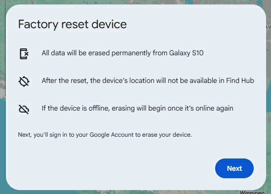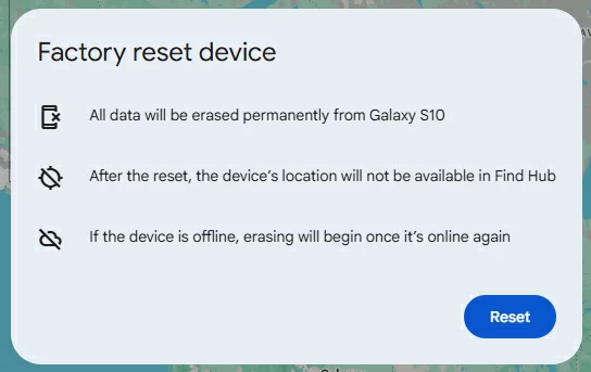 7. SmartThings Find will send signal to your Samsung phone remotely and begin the reset process. The time it takes to reset depends on the size of data and internet speed.