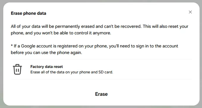 6. After verifying it's you, an "Erase phone data" warning window pops up. Review the messages carefully, then click Erase to confirm that you're going to wipe your Samsung phone completely.