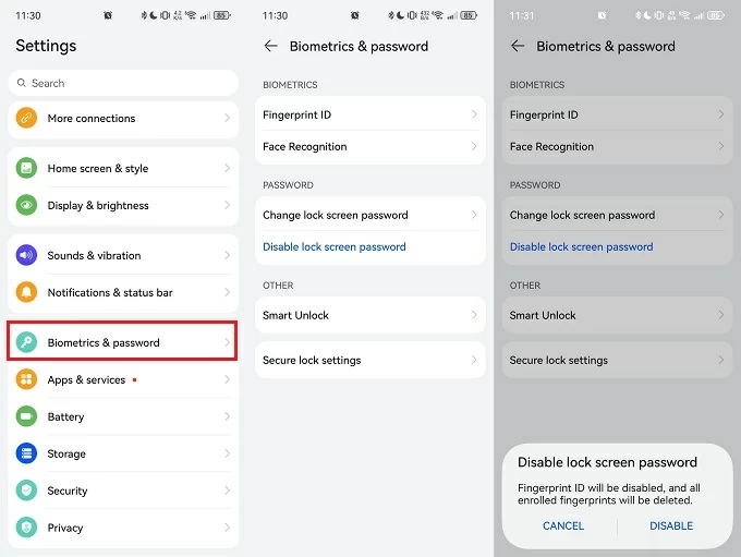 5. To remove PIN from Android lock screen, select None or Disable lock screen password.