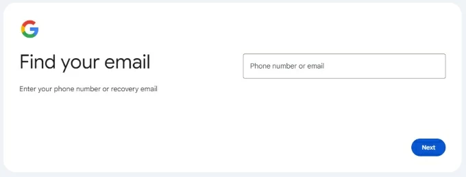1. On another computer or a working smartphone, visit Google account recovery website and enter the linked email address or phone number.