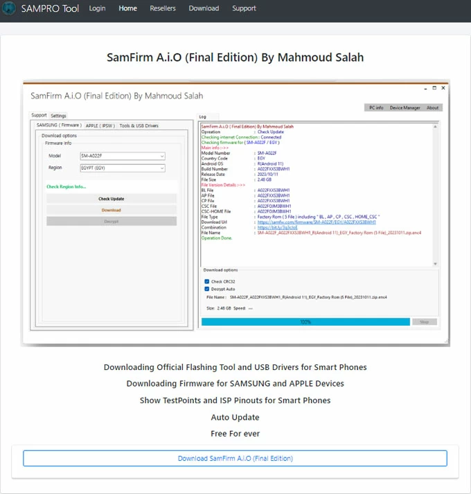Before you can install the latest version of SamFirm Tool, you will need to get hold of the installer of it. Luckily, it's possible to obtain SamFirm A.i.O (Final Edition) By Mahmoud Salah, as long as you can get to SamFirm official site - SAMPRO TOOL.