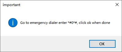 5. When prompted, tap Emergency Call panel on your device to enter dial pad and input *#0*# as required. Then Click OK button SamFirm software popup message.