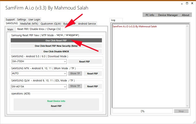 3. Click Reset FRP/ Disable Knox / Change CSC button at the top. In V3.1 SamFirm A.i.o, the button should be Reset FRP / Change CSC.