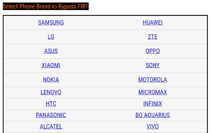 3. Select your phone brand, then choose your specific phone model. You will be directed to the steps to bypass FRP lock for your specific model.