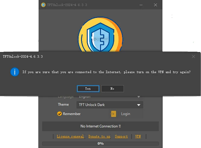 TFT Unlock Tool needs a VPN connection to run successfully. Turn on VPN to set up the internet first, and then click Login for activation. You'll need to pay for a VPN plan.