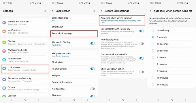 Adjust the time delay before the device re-locks after the screen turns off. Go to Settings > Lock screen > Screen lock settings, then enter your password/PIN/pattern to access Auto lock when screen turns off. It's best to select a longer time interval to prevent the screen from automatically locking in pockets or during shortcuts.
