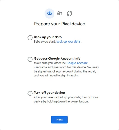 3. When you see the Prepare your Pixel device window, switch off your Google Pixel as required, and then click Next button.